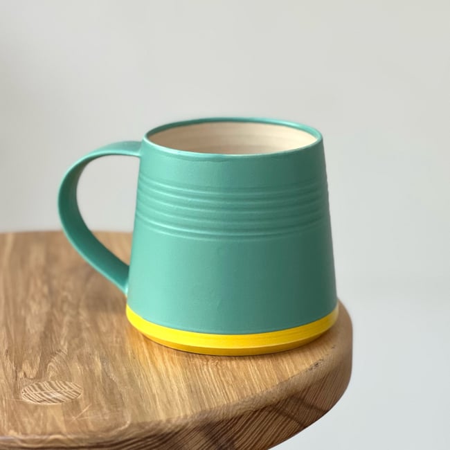 The exterior is glazed in a tactile, satin-matt glaze with a band of contrasting colour, whilst the interior has a glaze that is glossy and transparent.